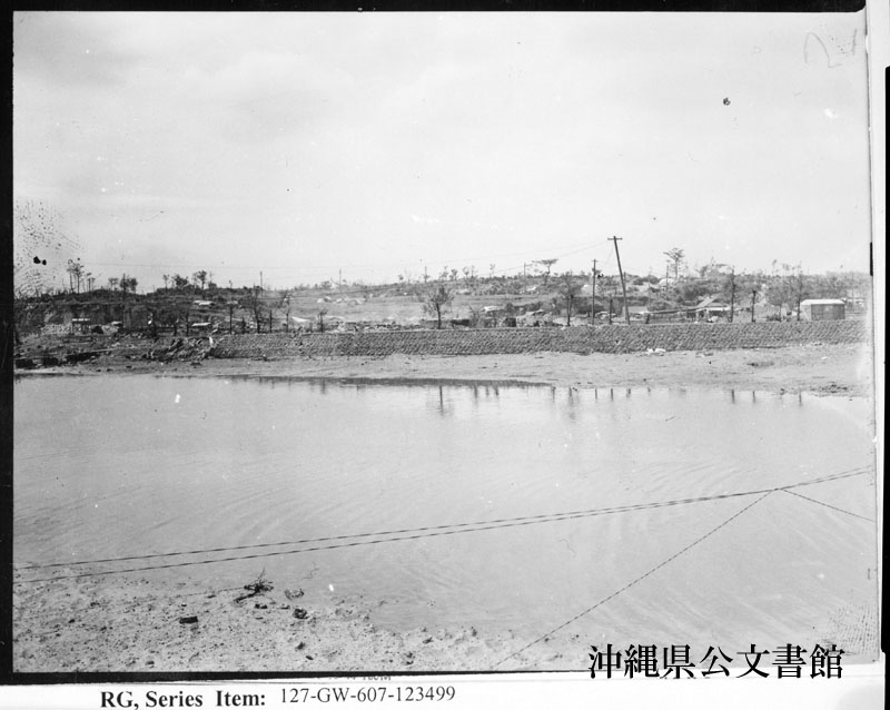 【和訳】 安謝川を南に眺める;防波堤、軟底、そして全体的に南へ盛り上がる地域と、それを越えて向こう側に那覇市郊外地が2つあることに注目