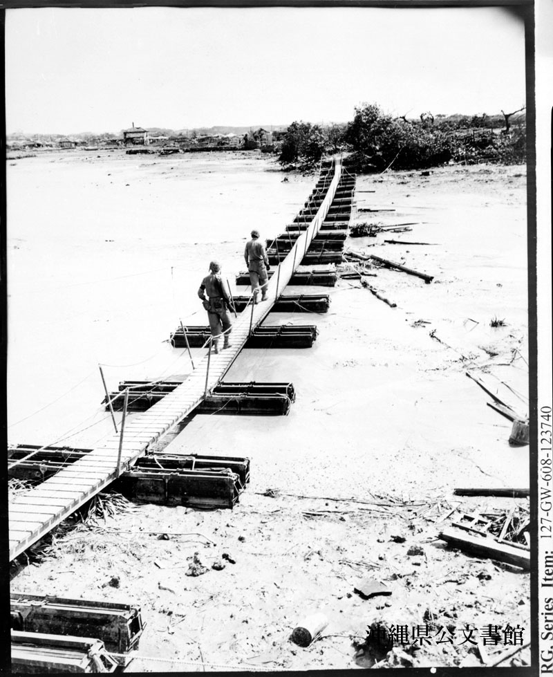 【和訳】 那覇の手前、安里川にかけられた仮設橋と仮設橋を渡る海兵隊員