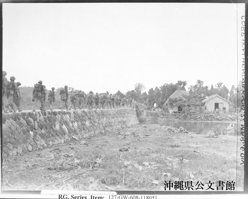 【和訳】 石製の古い橋を渡り前線へ向かう第22海兵師団第1大隊の兵士