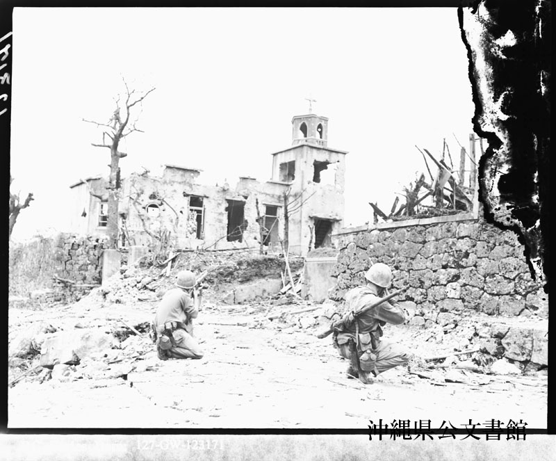 【和訳】 日本軍狙撃兵の根城・首里教会:首里城下にあるキリスト教会の搭状建物は日本軍狙撃兵の根城となっていた。写真手前の海兵隊員は、後方より哨戒兵が到着するのを待つ間、建物を見張っている。教会の教派は不明