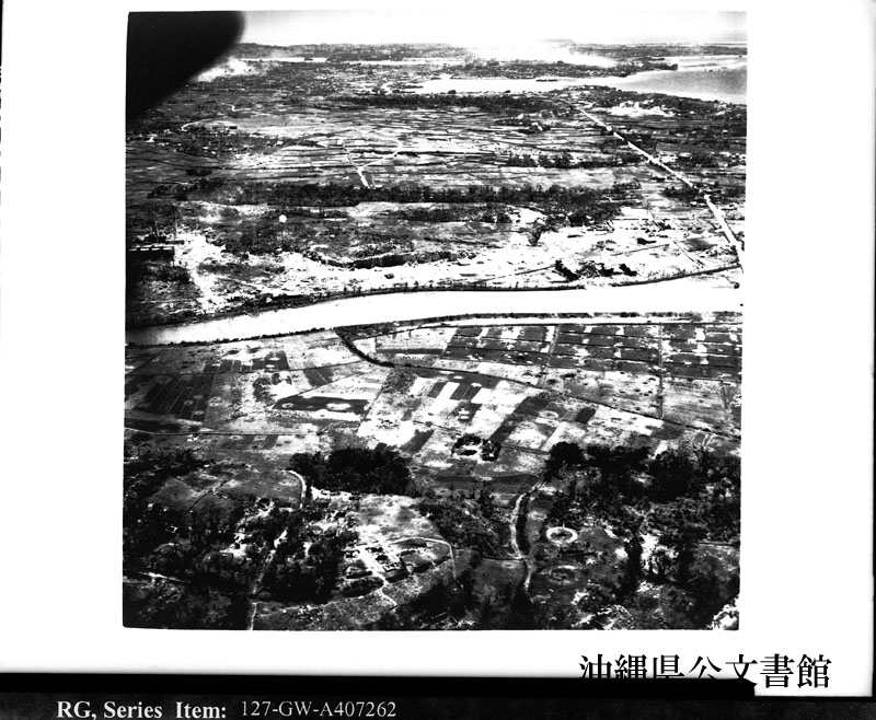 【和訳】 戦場—第1海兵師団の防衛区域。南方向に安謝川を望む。左手に破壊された製糖工場、安里川、那覇。遠景は小禄半島