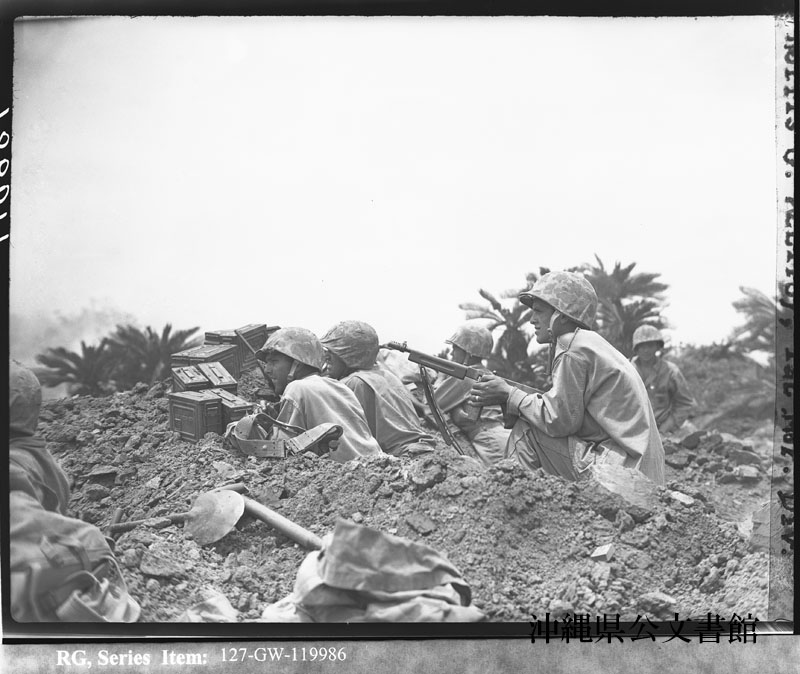 【和訳】 着弾跡の穴で守備につく機関銃部隊