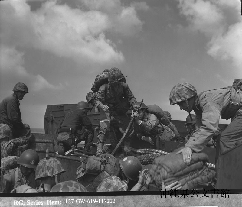 【和訳】 水陸両用トラクターに[装備を]積み込んでいる