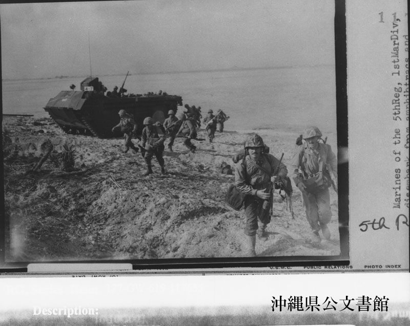 【和訳】 上陸日、水陸両用車から降りてイエロービーチ1を突進する第1海兵師団第5連隊の兵士たち。上陸第四陣
