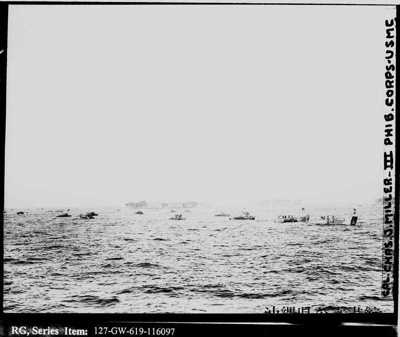 【和訳】 出発の車列を組む装甲水陸両用車両とトラクター。後方に揚陸艦や戦艦