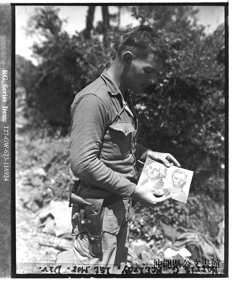 【和訳】 沖縄で見つけた2枚の写真を見せるグラハム二等軍曹メリーランド州出身)。1枚はワシントン大統領、もう1枚はリンカーン大統領である。