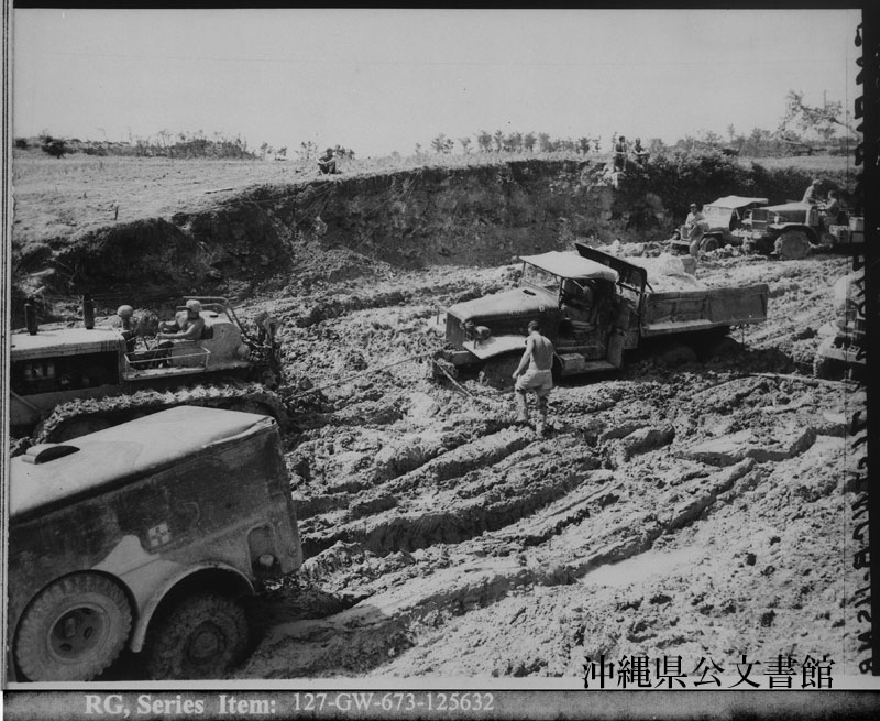 【和訳】 一号線でぬかるみにはまり、立ち往生するトラック。雨季には珍しい光景ではない。