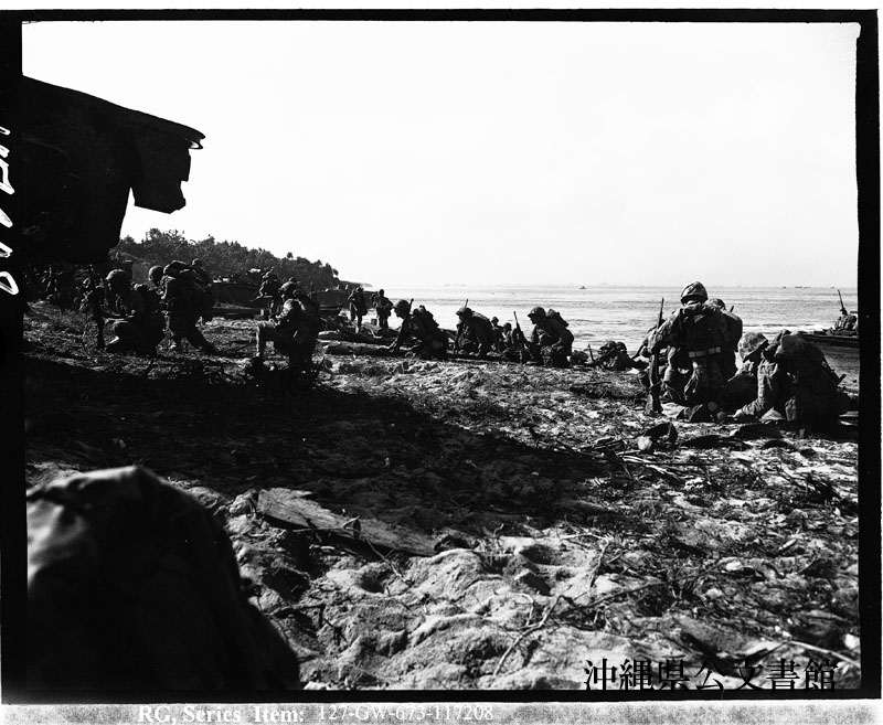 【和訳】 抵抗に遭うこともなく海岸に上陸を果たすと、戦闘を開始する前に瓦礫だらけの砂浜で慎重に地雷調査を行い、墓や丘腹の狙撃兵潜伏地を観察する、シェパード少将率いる第6海兵師団の海兵隊員。