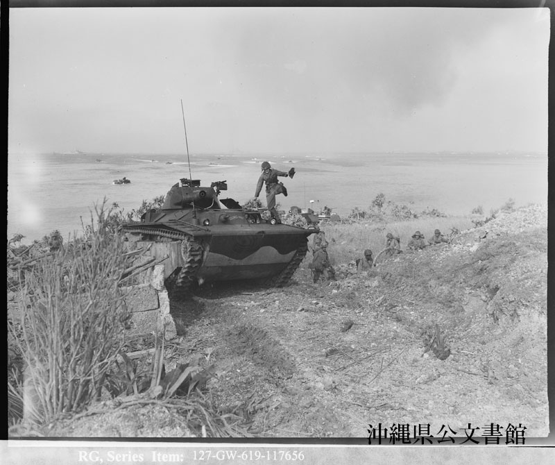 【和訳】 浜辺に停止する第1海兵師団第5連隊の水陸両用トラック。上陸開始時刻から43分後。イエロービーチ3
