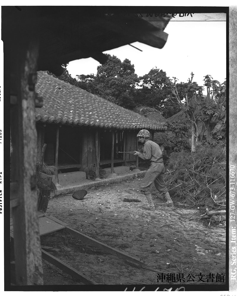 【和訳】 廃墟となった古い農家を調べる海兵隊員--狙撃兵を警戒している。