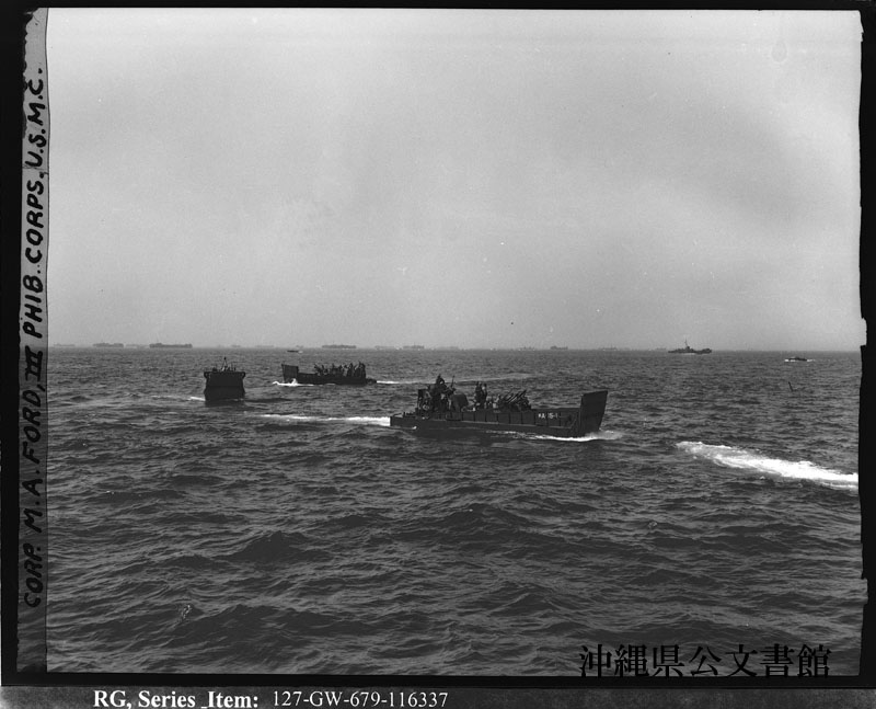 【和訳】 海兵隊の先陣が北側の海岸を攻撃してから2時間後、イエロービーチ2で波を立てて進む戦車用艀。中戦車を運搬している。