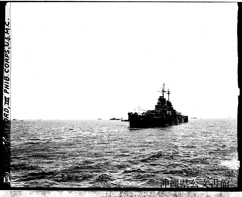 【和訳】 沖縄北部の海岸に上陸する海兵隊を援護するため、強力な大砲で一斉射撃をする巡洋艦。後方には海岸に向かう途中の小型揚陸艇が見える。