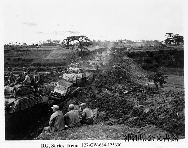 【和訳】 1号線を埋めつくす戦車、ジープ、ブルドーザーの長い車列。
