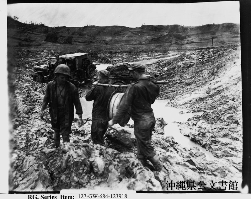 【和訳】 深いぬかるみでトラックが立ち往生したため、荷物を背負って運ぶ海兵隊員。