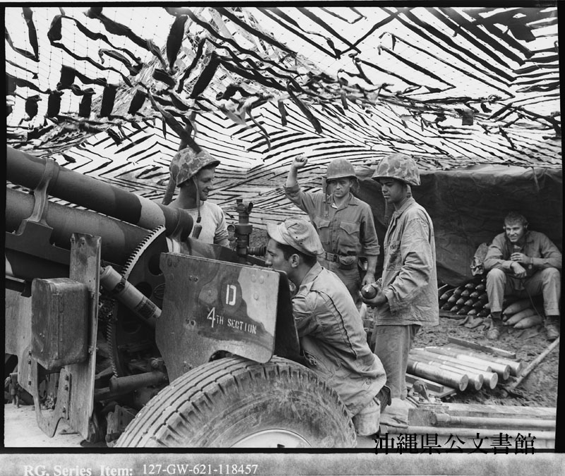 【和訳】 マクドナルド一等兵、ブーゲル伍長、ポーター一等兵と、後方にスモールウッド゙曹長。マクドナルドは、ブーゲル伍長が標的にねらいをつけている間、引き綱を引くため左側で待機。装填を担当するポーターは、空の薬莢がはじき出される瞬間を待って傍らに立っている。後方は、攻撃開始の指示を与えようと構えて立っているスモールウッド曹長