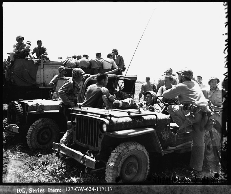 【和訳】 [部隊の]位置と、日本軍の動静に関する情報を知らせようと、師団司令部と交信する無線通信ジープ隊。これは、日本軍戦列の後方にある校舎で撮影された