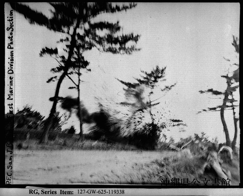 【和訳】 道路拡幅のため、木の切り株を取り除こうとTNT爆薬を爆発させる米工兵隊爆破部隊