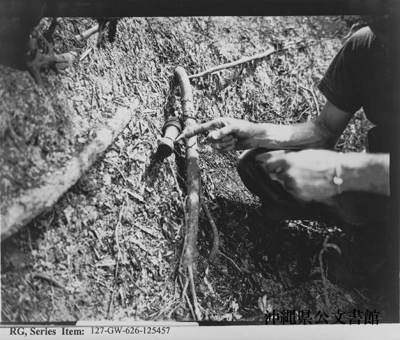 【和訳】 日本軍の手投げ棒型手榴弾(ポテトマッシャー)の解体手順。火薬や雷管を取り出すため、手榴弾を固定する。爆発しても怪我をしないように、手榴弾は離れた場所から引いた導線で木の根元に縛りつけてある。