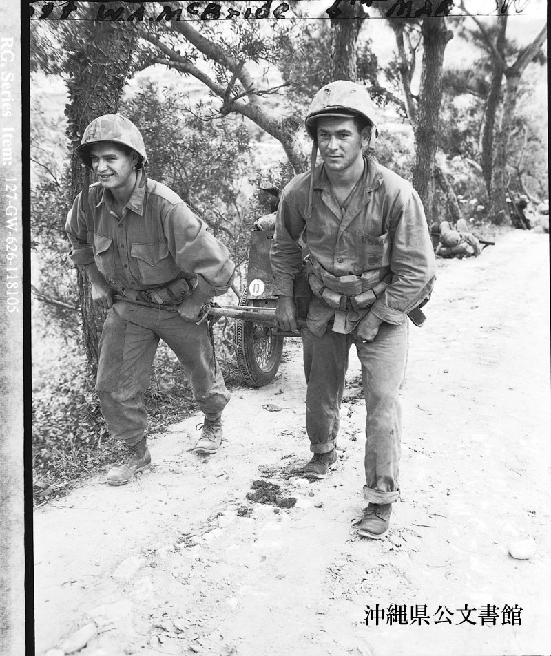 【和訳】 弾薬を牽引するオハイオ州出身の海兵隊員2名。左から、バーンズ二等兵とクリノフ二等兵。