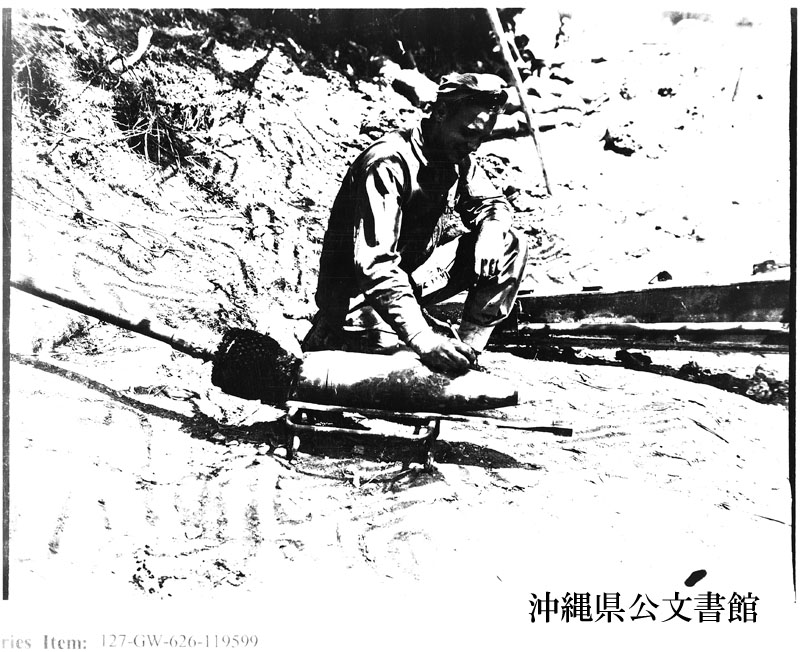 【和訳】 ペリリュー戦線でも戦い、海外に派兵されて9ヶ月になるメインケ一等兵(オハイオ州出身)。155ミリ砲弾に「沖縄島南部戦線関係者各位」と宛名書きをしている。彼は砲兵隊きっての砲手である(彼が、大砲発射用の引き綱を引く)。