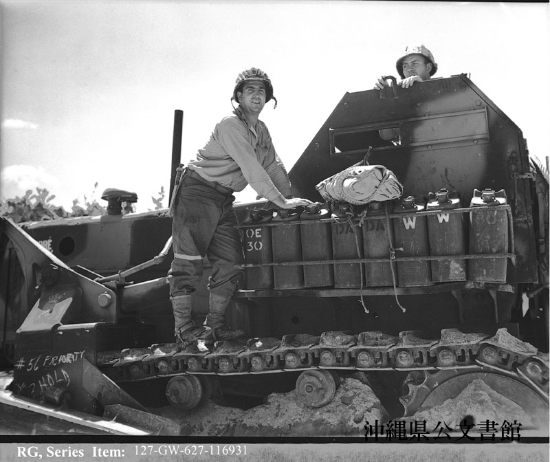 【和訳】 ブルドーザー操縦士、(左から)シャンパン軍曹(ニューハンプシャー州出身)とウィルソン掌帆兵(テネシー州出身)。