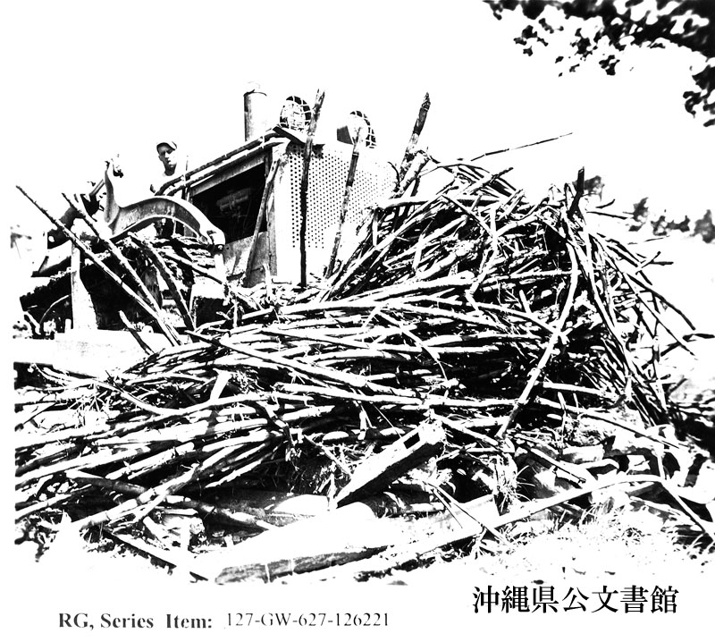 【和訳】 司令部用地にするため、サトウキビを取り除いているブルドーザー。