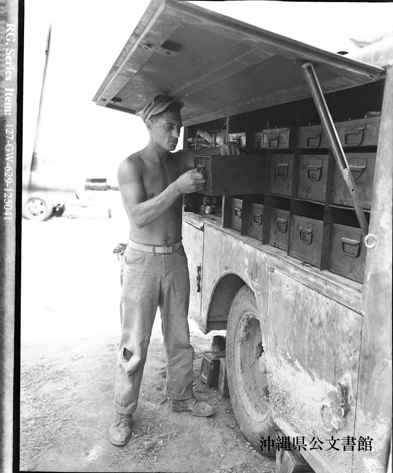 【和訳】 移動修理トラックから物資を取っている海兵隊兵站係フェルナンデス三等軍曹(ニュージャージー州出身)。