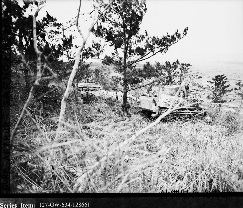 【和訳】 沖縄島南端の高台で、最後の高台を攻略するため、ずらりと並ぶ戦車。