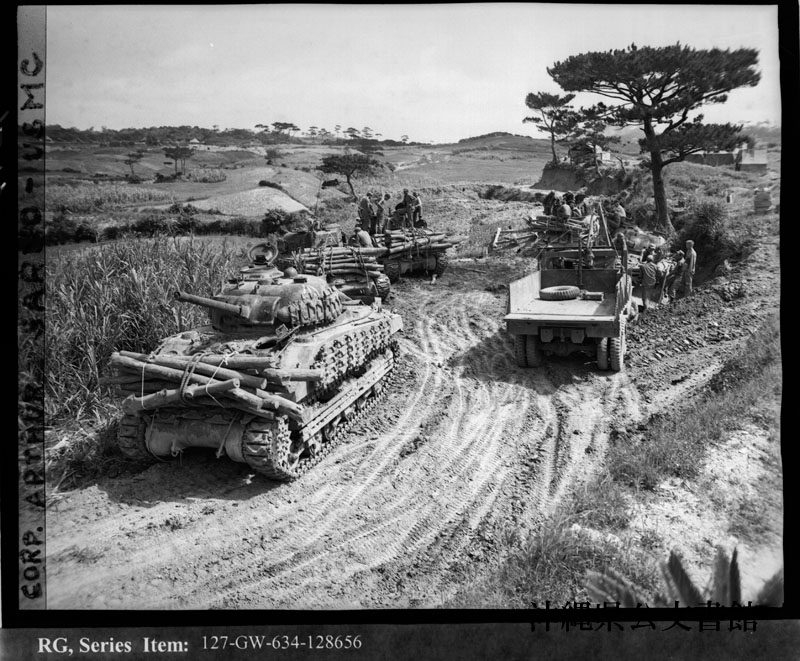 【和訳】 集結地を出発する直前の5両の戦車。注)全ての戦車は道のくぼみを埋めるための丸太を積んでいる。