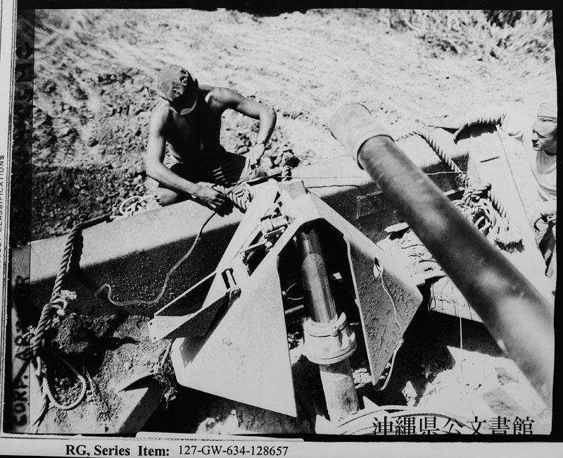 【和訳】 戦車前方に丸太を固定するロープにワイヤーを締め付ける海兵隊員。ワイヤーに点火すると、その爆発でロープが燃え、丸太は道のくぼみに放たれる。