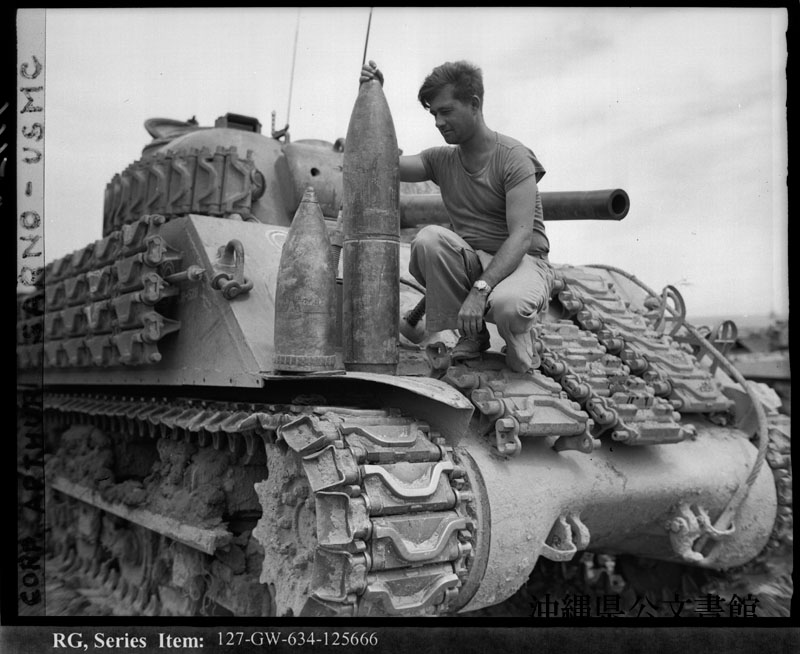 【和訳】 戦車の上の第6戦車大隊指揮官デニグ中佐バージニア州出身)と、戦車攻撃に使われた日本軍の砲弾2発。長い方の砲弾は奇妙な音を発するので、海兵隊員たちから“泣き虫”というあだ名を付けられている。