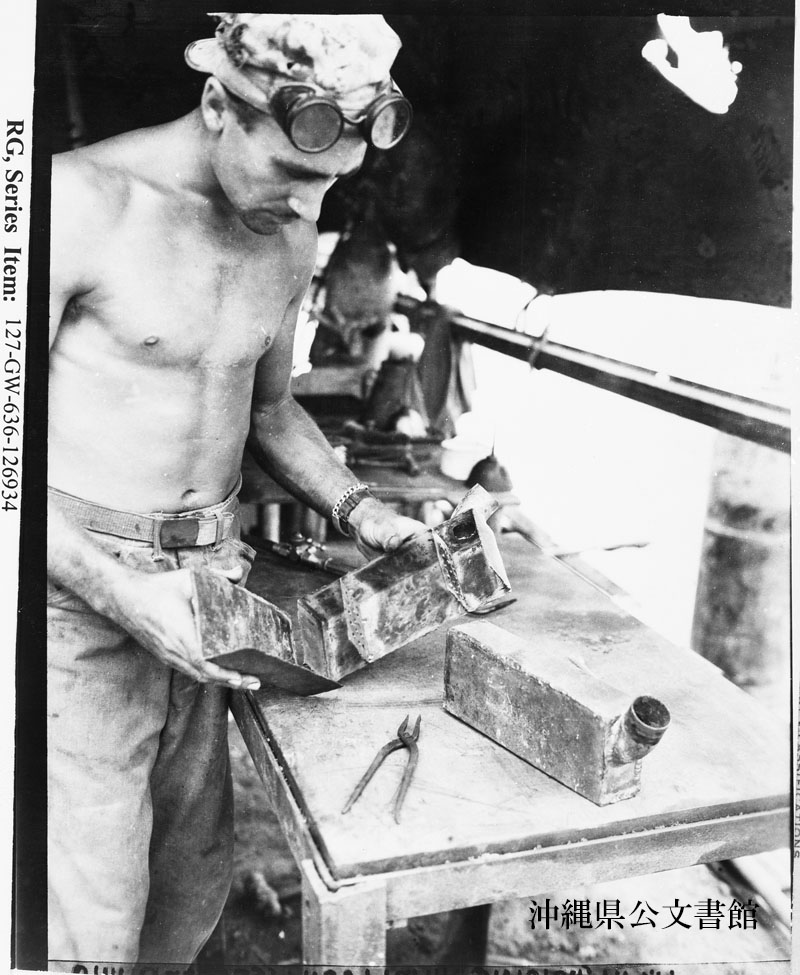 【和訳】 ジープ用マフラーを作る海兵隊員。日本軍のドラム缶を切断して作った手作りのジープ用マフラー。マフラー作りは、輸送部隊のコバート一等兵オハイオ州出身)の得意技。
