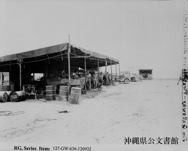 【和訳】 レールで作られた修理所。鉄道や路面電車のレールは、第1海兵師団輸送大隊の6つに仕切られた修理所の骨組みになる。屋根には路面電車の天井を覆っていたキャンバス地が張られている。
