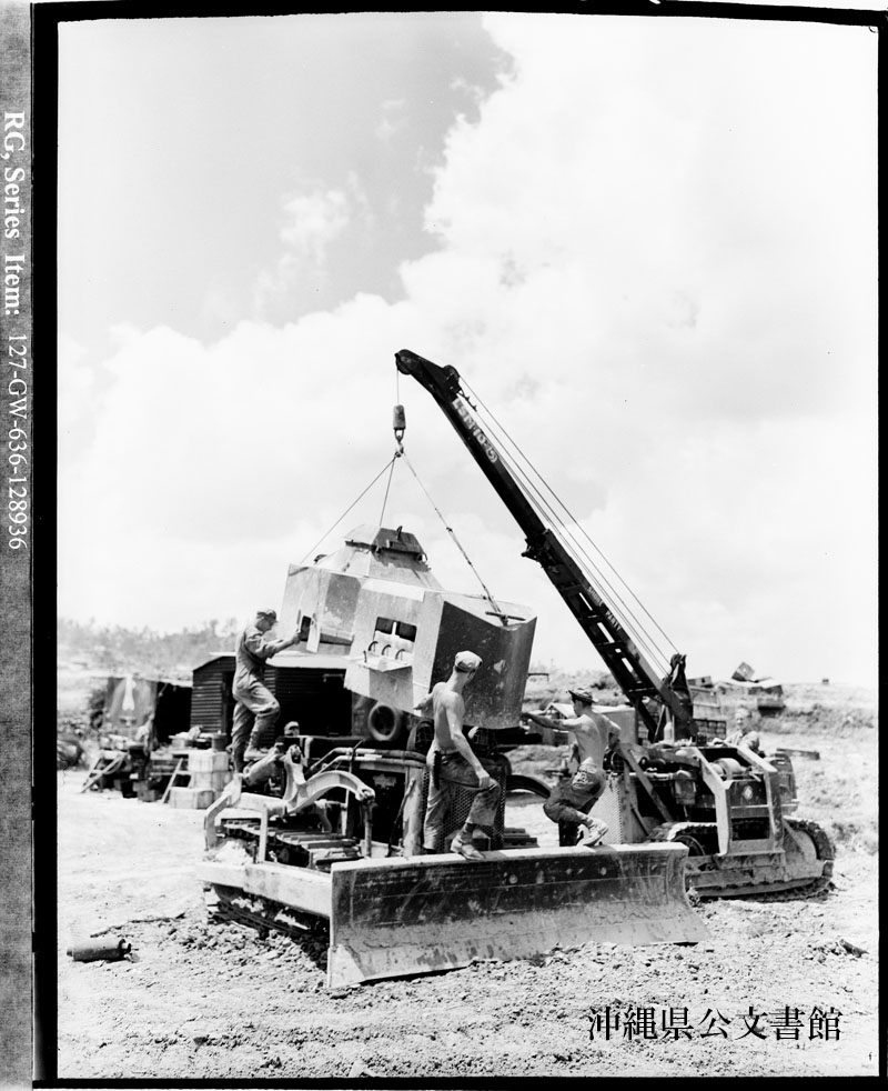 【和訳】 「コート装甲板)」を取り付けたブルドーザー。周辺に潜む狙撃兵に備え、第1工兵大隊の海兵隊員によって装甲板が取り付けられるブルドーザー。ライフルやマシンガンの絶え間ない銃撃の下で、工兵隊員は道路の建設に当たった。