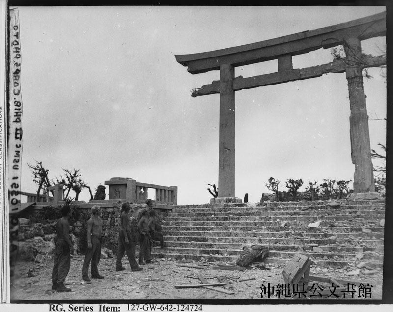 【和訳】 那覇で廃墟となった神社を見ている海兵隊員。