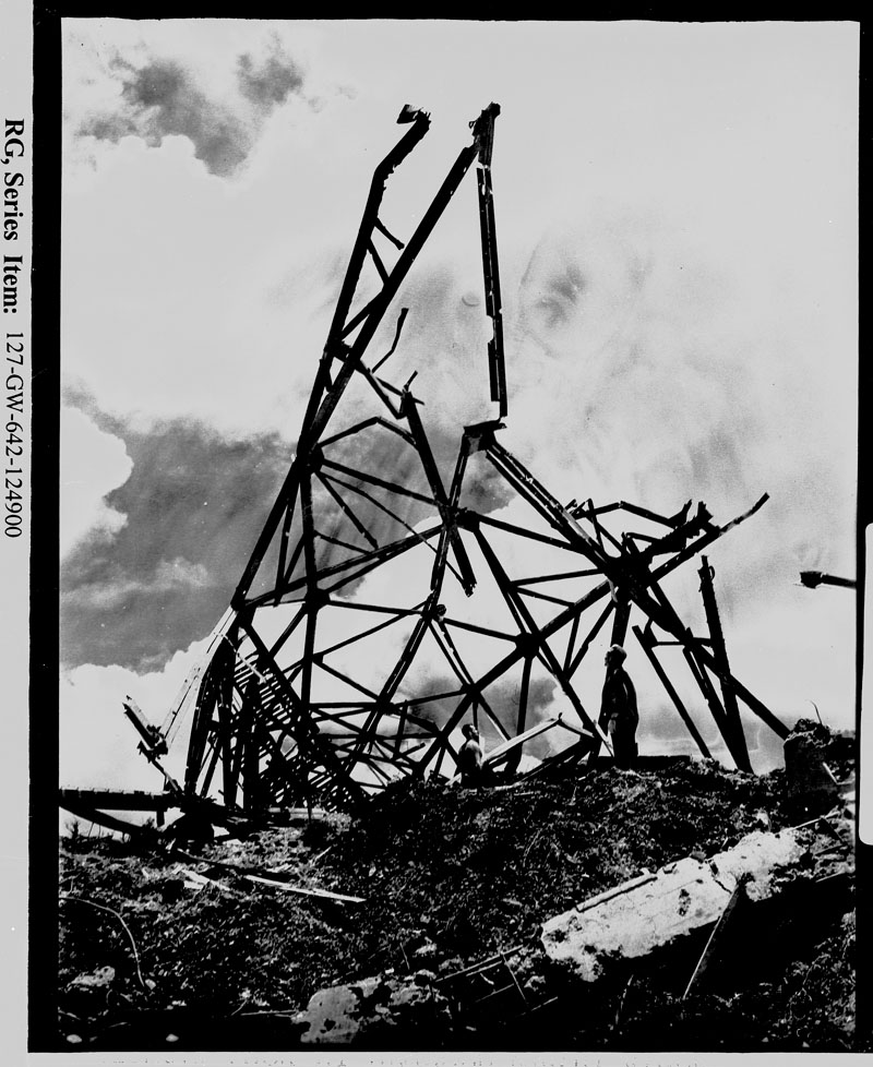 【和訳】 500ポンド爆弾によって被害を受けた無線塔を見る海兵隊員。