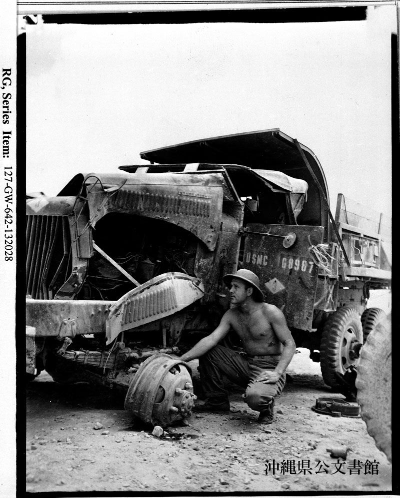 【和訳】 地雷のしわざ。日本軍の地雷を踏んだために生じたトラックの損傷具合を調べる海兵隊のブルンス二等兵コロラド州出身)。彼は1200マイルに及ぶ前線の道路を災難に遭わずに運転してきた。
