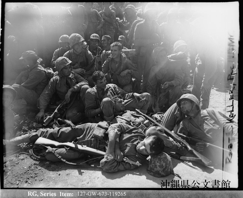 【和訳】 仲尾次(?)の町を占拠した後に休息する海兵隊員。
