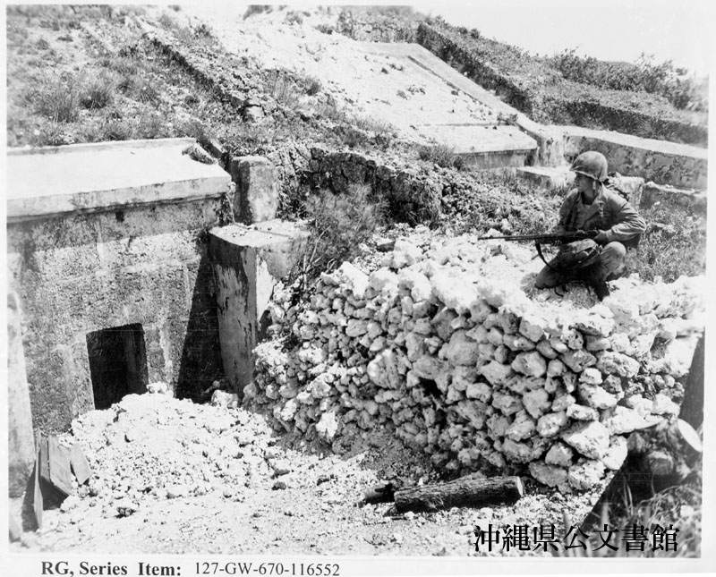 【和訳】 ブローニング自動小銃を手に日本軍のトーチカを調べる海兵隊員。第7海兵連隊の経験豊富な兵士らは日本軍の防衛線を慎重に通過していた。