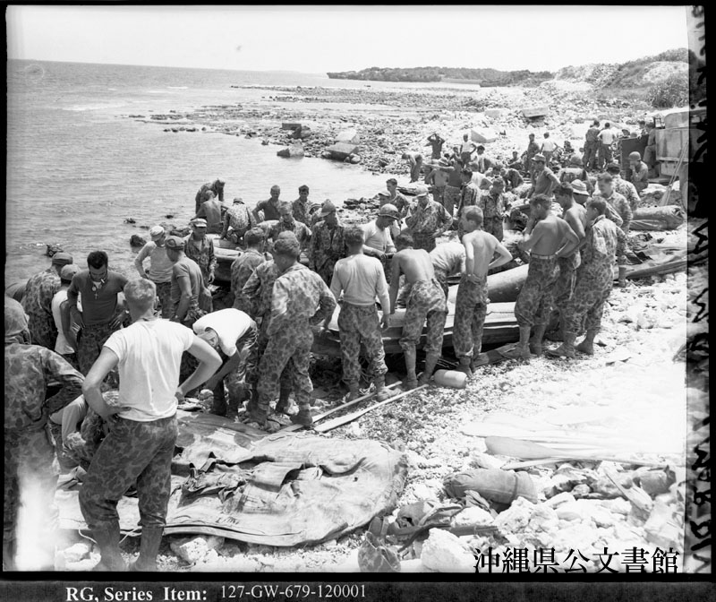 【和訳】 浜比嘉島への上陸のため、ゴムボートを用意する第1海兵師団偵察中隊。