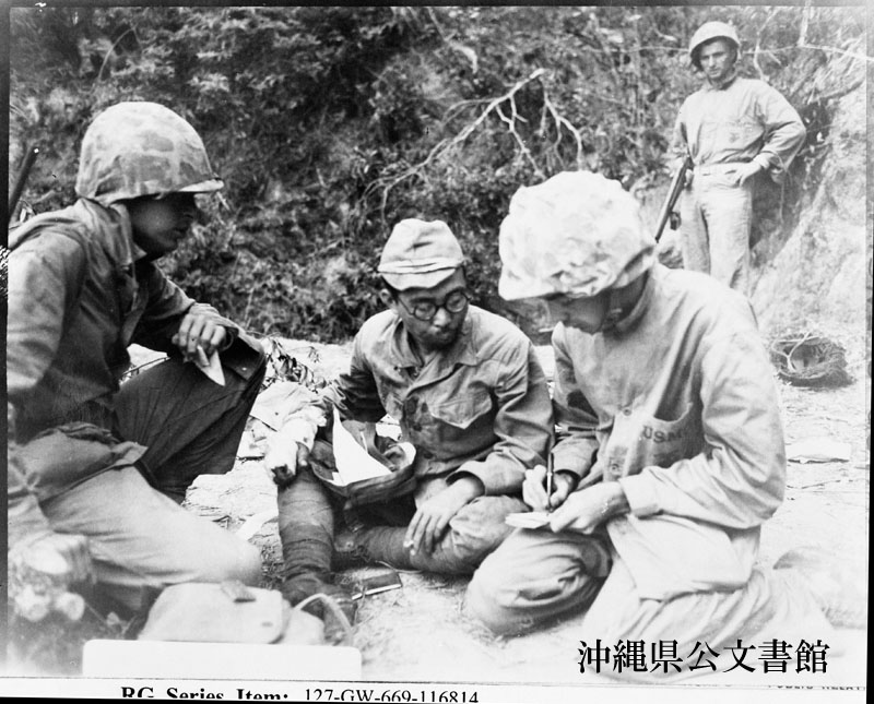 【和訳】 左から:海兵隊戦闘広報係のレーン3等軍曹(ケンタッキー州出身)と通訳のマーフィー3等軍曹(アイダホ州出身)。2人は道路下の排水溝で日本兵の上等兵に尋問中。