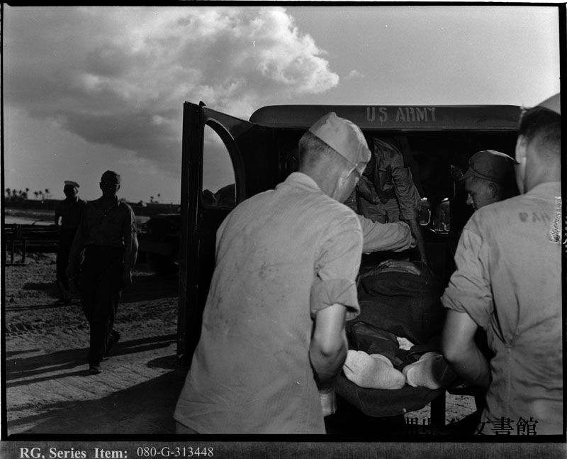 【和訳】 沖縄で負傷した兵士らが病院船から下船する様子。マリアナ諸島のグアムにて。