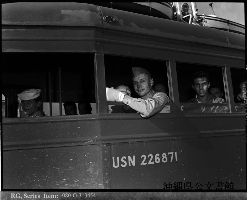 【和訳】 沖縄で負傷した兵士らが病院船から下船する様子。マリアナ諸島のグアムにて。