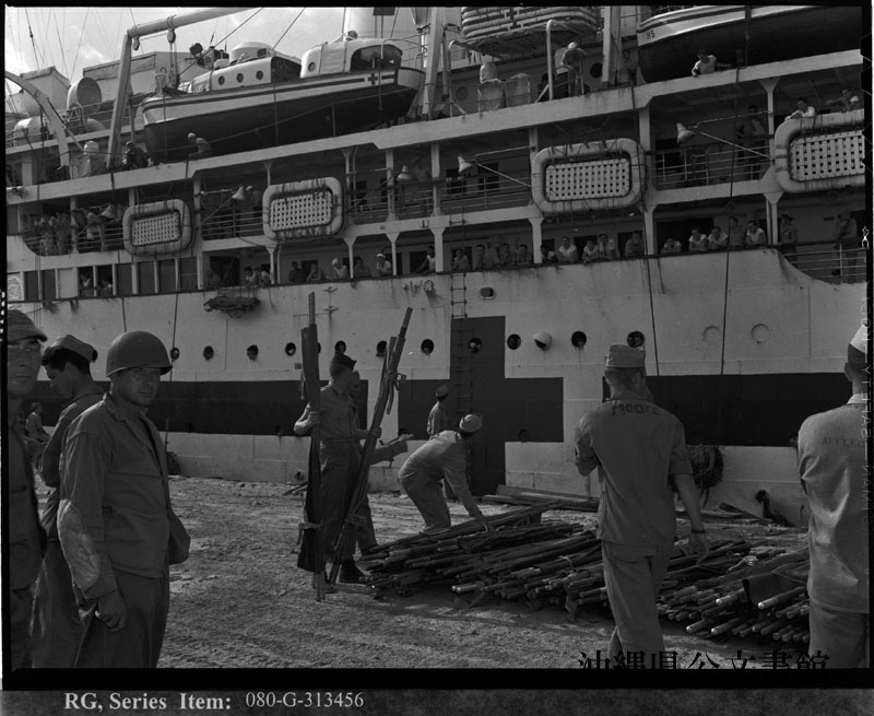 【和訳】 沖縄で負傷した兵士らが病院船から下船する様子。マリアナ諸島のグアムにて。