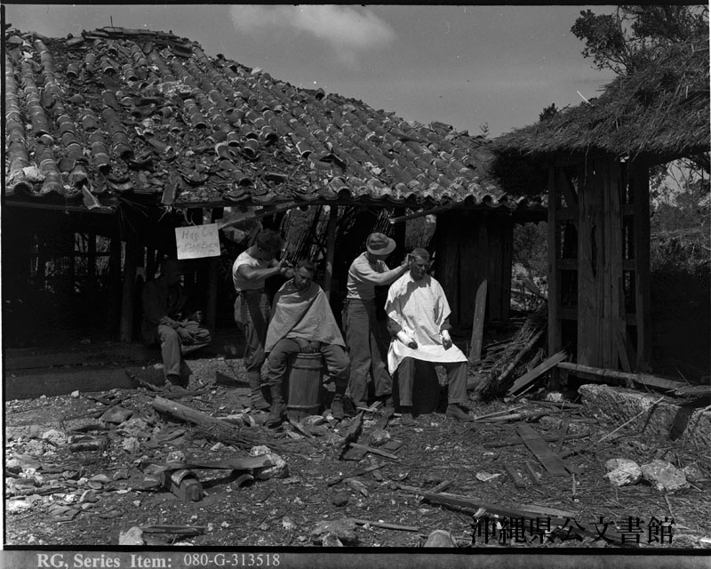 【和訳】 沖縄で初の海兵隊の理髪店。イアンノン伍長とジーグラー3等軍曹がコスタ2等兵とウィリアムズ大尉の髪を切る。