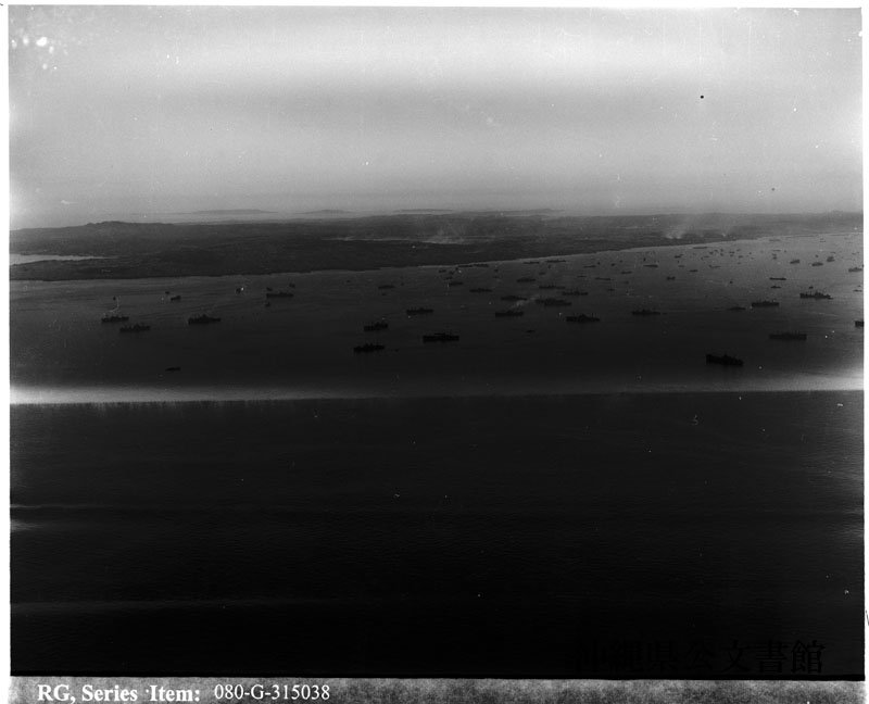 【和訳】 艦隊の空中写真。沖縄近海にて。