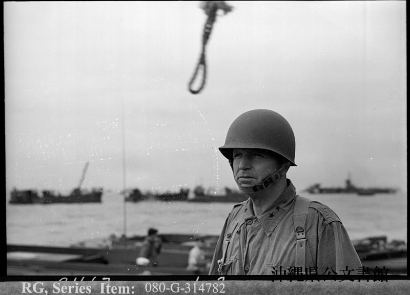 【和訳】 ターナー中将が指揮を執る旗艦の揚陸指揮艦エルドラド(AGC-11)から小型艇に乗るバックナー陸軍中将。上陸地点となった海岸に向かうところ。沖縄にて。