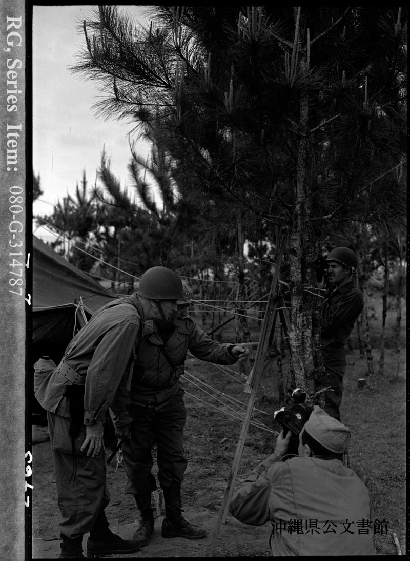 【和訳】 バックナー陸軍中将と陸軍第7軍団[第24軍団]軍団長のホッジ少将。沖縄の司令部にて。揚陸指揮艦エルドラド(AGC-11)から撮影。