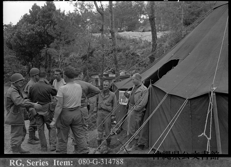 【和訳】 バックナー陸軍中将と陸軍第7軍団[第24軍団]軍団長のホッジ少将。沖縄の司令部にて。揚陸指揮艦エルドラド(AGC-11)から撮影。