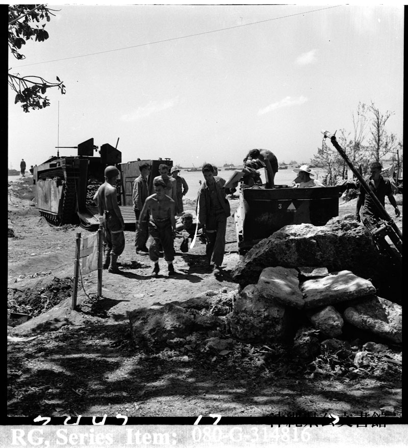 【和訳】 背中の傷を治療するため、ウィーゼル水陸両用車で海岸に後送された兵士。